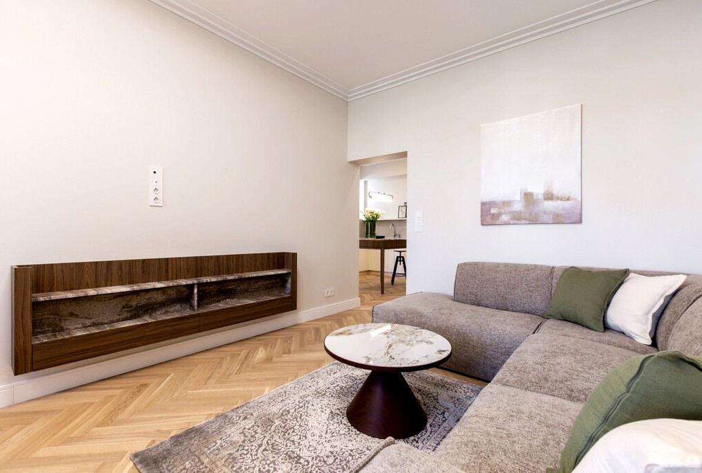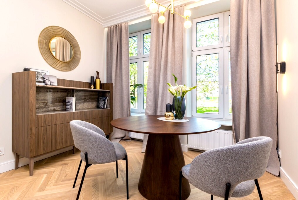 Wnętrze zostało zaprojektowane przez architekta i wykończone z wyjątkową dbałością o detale – jakościowe meble, spójna estetyka oraz wysokość pomieszczeń ok. 3 m, która nadaje przestrzeni elegancji i oddechu. Mieszkanie jest w pełni umeblowane i wyposażone – gotowe do zamieszkania.
