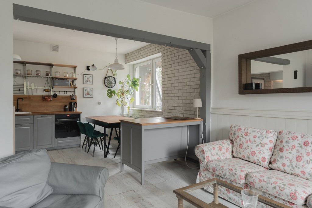 piętro- sypialnia, pokój dzienny połączony z kuchnią, łazienka, hall