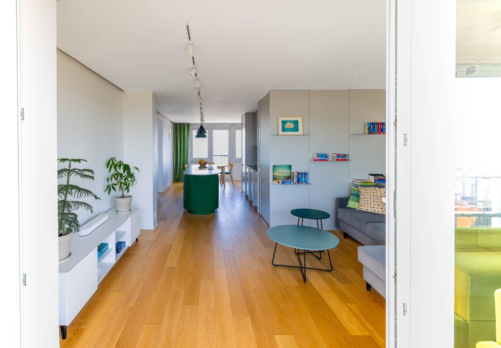 Apartament o powierzchni 86,5 m² (powierzchnia w księdze wieczystej wynosi 77,9 m² przed przebudową) składa się z trzech pokoi. W jego skład wchodzą: